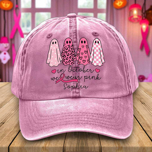 Custom Breast Cancer Distressed Washed Cotton Printed Hat , In October We Wear Pink Ghost Hat, Cancer Support Hat, Cancer Awareness Shirt, Cancer Fighter Gifts UKND5180805